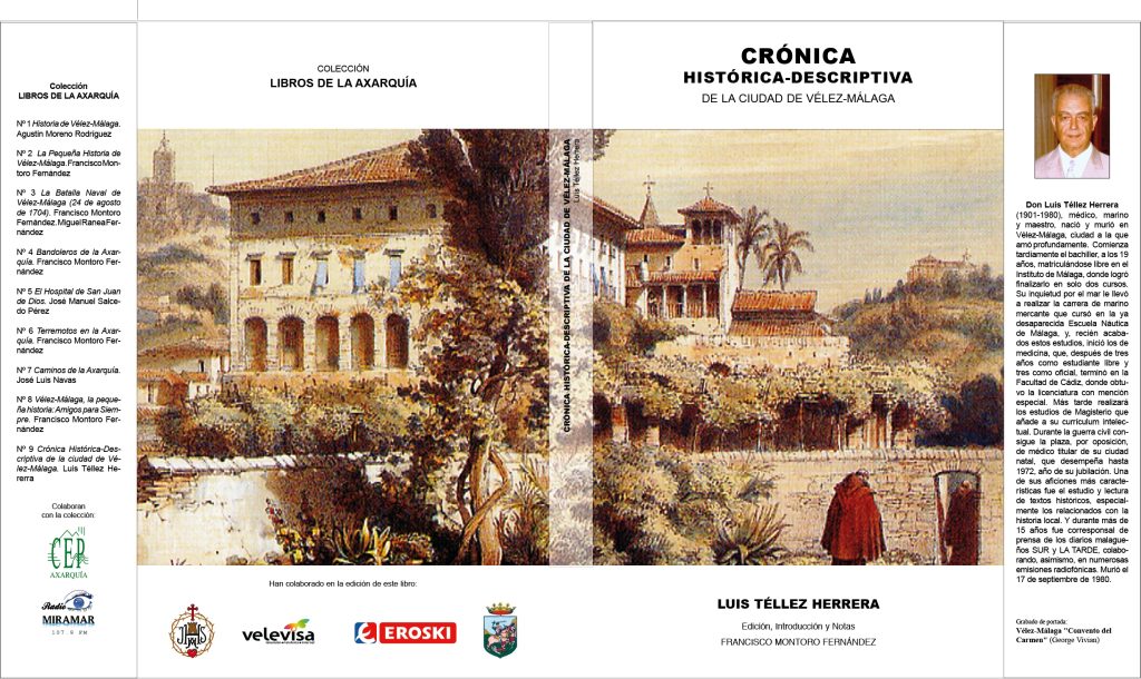 Cuando en 1982 publicamos nuestro libro Cien veleños notables, al referirnos a don Luis Téllez Herrera, decíamos que había escrito una “Historia de Vélez-Málaga” – según lo que él mismo nos había contado – y que, tras enviarla a la Diputación Provincial de Málaga para su publicación, se había extraviado. No había conservado copia su autor, y, de la misma, apenas se conservaban algunas cuartillas manuscritas sueltas, según noticias de la familia. No sabíamos ni el título, ni la extensión, ni los capítulos incluidos, ni nada de nada. Más tarde hemos sabido que el texto había sido mecanografiado por el veterano funcionario municipal don Enrique Caralampio, siguiendo instruc-ciones expresas de la alcaldía.